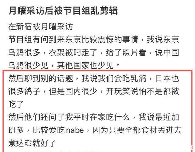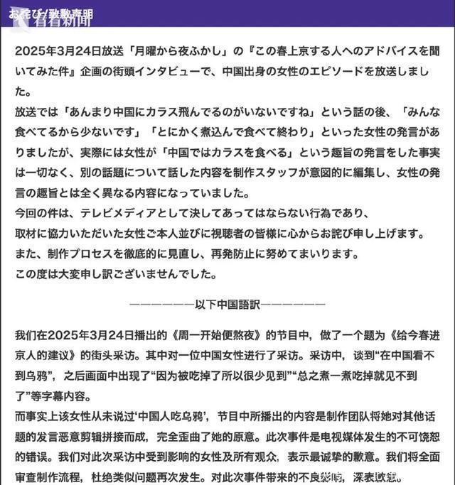 今年春天日本电视台那档节目引发了一场不小的风波,那位参与采访的中国女性观众事后公开指出,自己在节目中的原本发言已经被节目组严重曲解,她澄清自己从未在采访中说过如“中国人吃乌鸦”之类的内容。