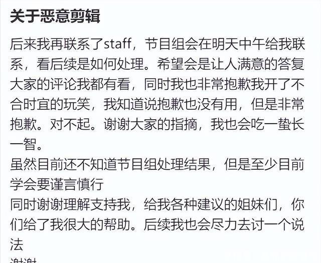 面对质疑日本电视台𱆏日在官网以中日双语正式致歉,承认是由于制作团队的不当剪辑,才导致她的原意现在被完全歪曲,电视台社长福田博之也公开表示,这样的行为极不应该,是电视媒体不可饶恕的错误。